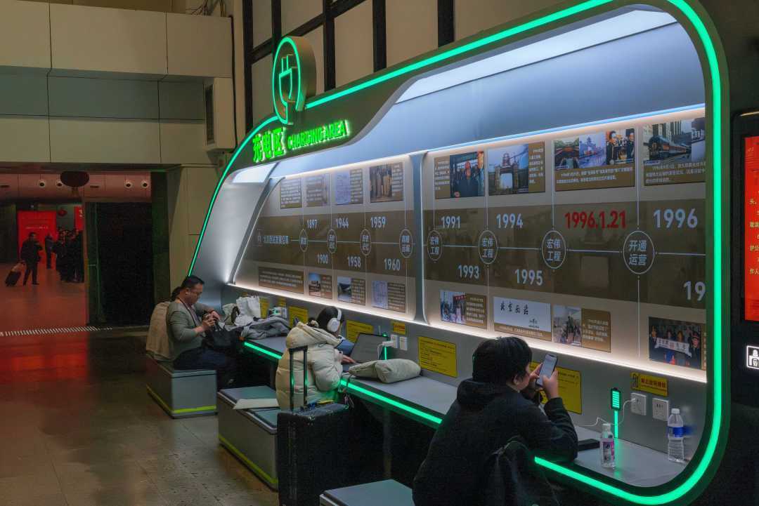 北京西站的自助充电区为旅客提供免费充电服务,温馨回家路。