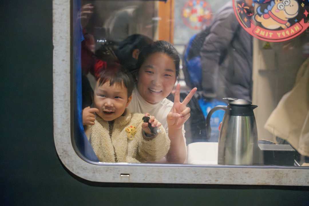 车厢内,小朋友向窗外挥手。