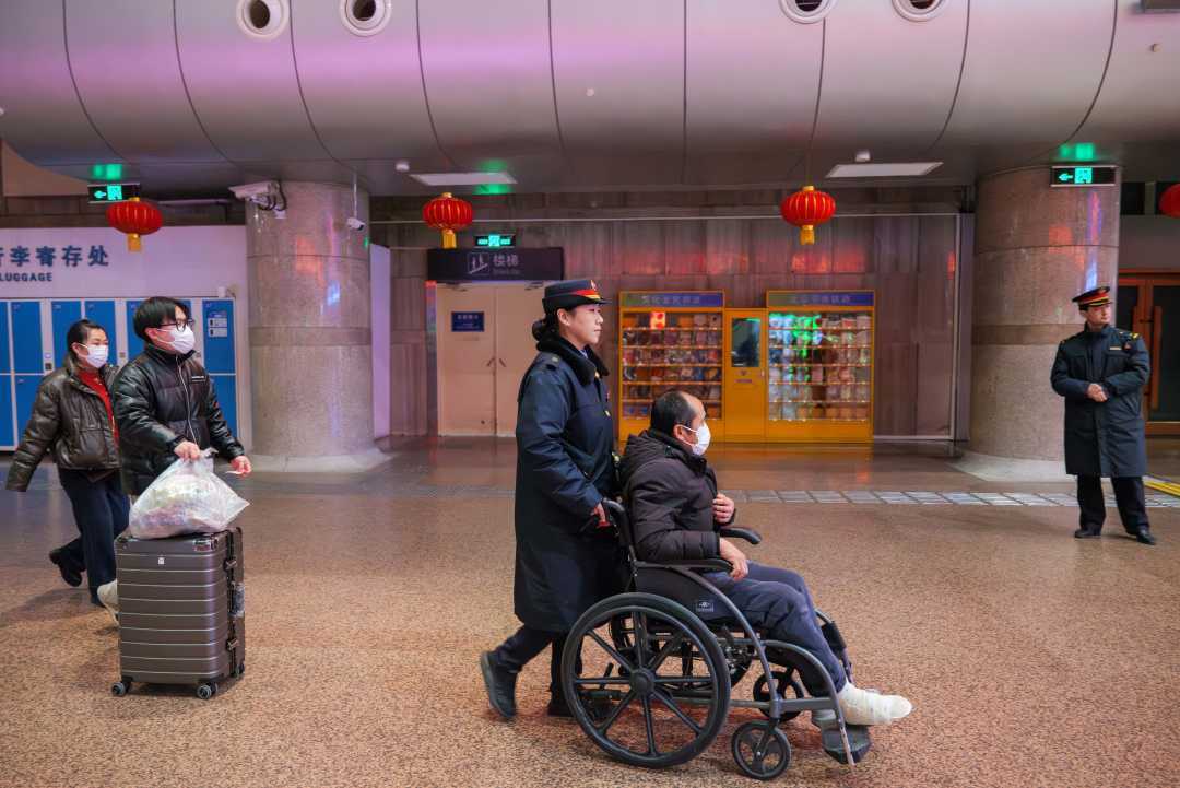 北京西站内,工作人员在协助行走不便旅客乘车。