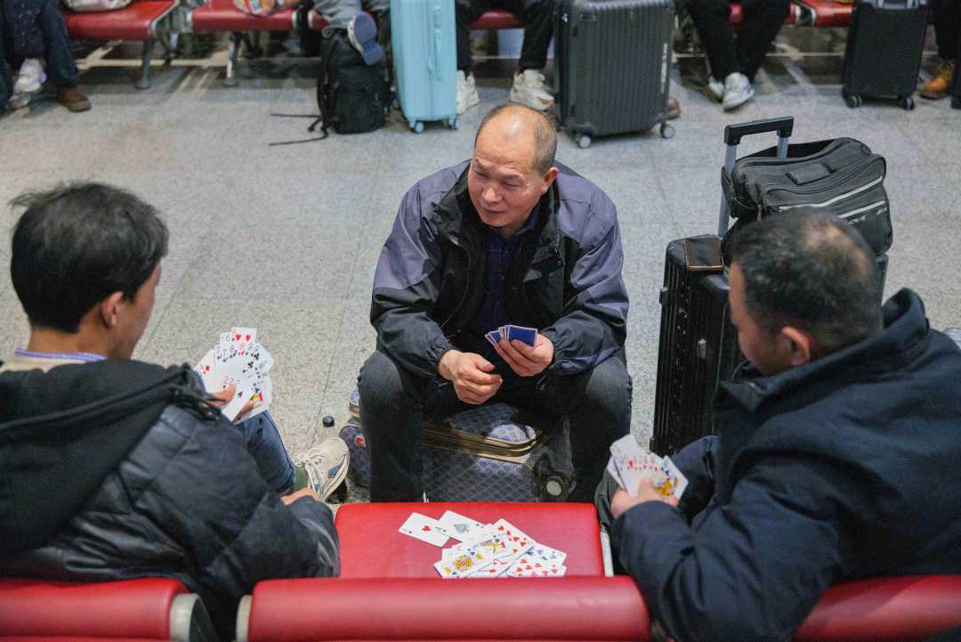 候车室内,乘客在打牌,等候检票。