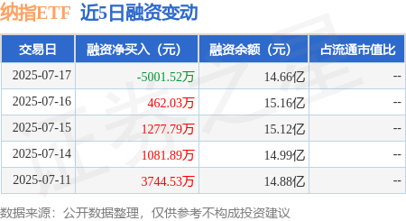 本站消息,7月17日,纳指ETF(513100)融资买入1.5亿元,融资偿还2.0亿元,融资净卖出5001.52万元,融资余额14.66亿元,近20个交易日中有13个交易日出现融资净买入。